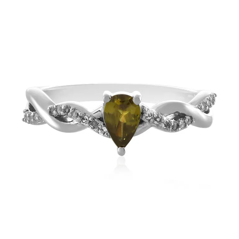 Entdecken Sie die Anziehungskraft dieses bezaubernden brasilianischen Sphen-Silberrings mit einem einzigartigen tropfenförmigen Sphen-Edelstein. Mit 0,38 Karat ist er elegant in einem schlanken 925er Sterling Silberband eingefasst und wiegt etwa 2,26 Gramm. Der Ring ist mit 21 funkelnden weißen Topas-Akzenten von insgesamt 0,101 Karat verziert und versprüht einen raffinierten Charme. Das gedrehte Silberdesign des Rings ergänzt jedes Ensemble und macht ihn zu einem idealen Accessoire sowohl für die Eleganz des Alltags als auch für besondere Abendveranstaltungen.