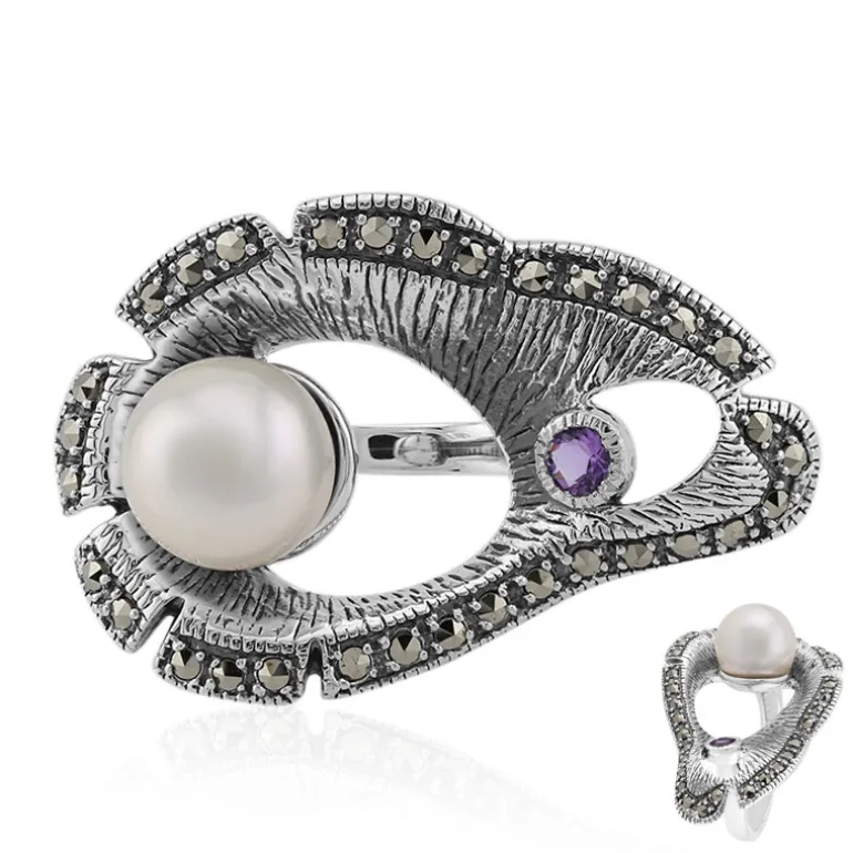 Tauchen Sie ein in die Pracht dieses raffinierten Rings mit einer glänzenden 9 mm großen runden Süßwasserperle aus China, die elegant mit einem fesselnden brasilianischen Amethysten und einer Reihe funkelnder österreichischer Markasitsteine von insgesamt 0,448 ct. kombiniert ist. Dieses aus 925er Sterlingsilber gefertigte Schmuckstück strahlt zeitlose Eleganz aus und eignet sich sowohl für den Alltag als auch für besondere Anlässe. Sein einzigartiges, auffälliges Design sorgt für Gesprächsstoff und zeugt von Ihrem exquisiten Geschmack für feinen Schmuck.