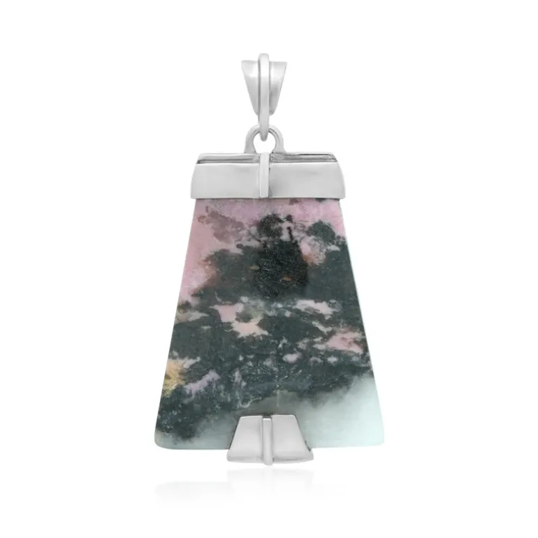 Entdecken Sie die bezaubernde Anziehungskraft dieses 53-karätigen Anhängers aus Sulawesi-Rhodonit, der elegant in platiniertem 925er Sterlingsilber gefasst ist. Dieser 35×30 mm große Edelstein im Cabochon-Schliff stammt von der tropischen Insel Indonesien und besticht durch seine faszinierenden Rosa- und Grüntöne, die an die mythische Essenz des Barong von Bali erinnern. Die großzügige Größe des Anhängers, 50×30 mm, macht ihn zu einem auffälligen Schmuckstück. Dieser exquisite Anhänger passt sowohl zu legerer als auch zu formeller Kleidung und zeugt von beständigem Stil und kulturellem Charme.