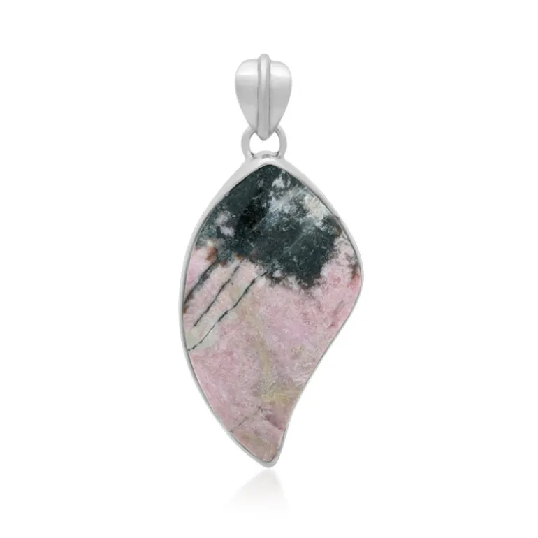 Entdecken Sie die bezaubernde Anziehungskraft dieses indonesischen Rhodonit-Anhängers aus Sulawesi, der kunstvoll aus 925er Sterlingsilber mit einer Platinveredelung für dauerhaften Glanz gefertigt ist. Sein einzigartiger 26-karätiger Cabochon-Schliff besticht durch eine ausgeprägte rosa Palette und schwarze Muster, die an den Barong-Tanz auf Bali erinnern. Mit einer Größe von ca. 45×22 mm ist er ein auffälliges Schmuckstück. Er ist ideal, um Ihrer Kleidung einen Hauch von kultureller Raffinesse zu verleihen, und eignet sich sowohl für zwanglose Ausflüge als auch für besondere Anlässe.