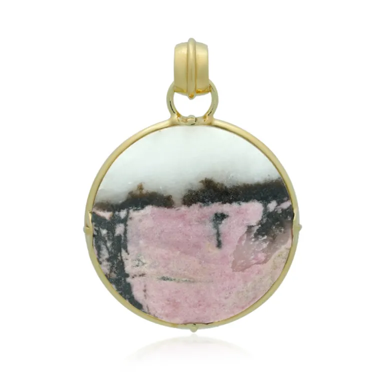 Tauchen Sie ein in die mystische Anziehungskraft Indonesiens mit diesem vom balinesischen Barong inspirierten Anhänger. Ein fesselnder Sulawesi-Rhodonit-Cabochon mit einem Gewicht von beachtlichen 42 Karat ist das Herzstück dieses exquisiten Stücks. Der abgerundete und geschliffene Cabochon hat einen Durchmesser von ca. 30 mm und ist in glänzendes 925er Sterlingsilber mit einer reichen Goldauflage gefasst. Dieser Anhänger strahlt einen spirituellen Charme aus, der sowohl zu legeren als auch zu formellen Anlässen passt und bei jedem Treffen für Gesprächsstoff sorgen wird. Seine beachtliche Größe und sein einzigartiges kulturelles Design machen ihn zu einem idealen Accessoire für alle, die eine Vorliebe für kunsthandwerkliche Schätze haben.