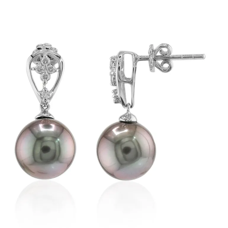Entdecken Sie die Faszination des Ozeans mit diesen atemberaubenden Ohrringen aus glänzenden Tahiti-Perlen und 9K-Weißgold. Jeder Ohrring ist mit einer Konstellation von 0,14 Karat funkelnden Diamanten in Reinheit SI1 geschmückt, die den bezaubernden Glanz der Perlen noch verstärken. Diese Ohrringe sind eine Anspielung auf die klassische Eleganz mit einem modernen Twist und eignen sich für formelle Anlässe und können jedes Ensemble aufwerten, von einem schicken Business-Outfit bis hin zu einem Abendkleid.