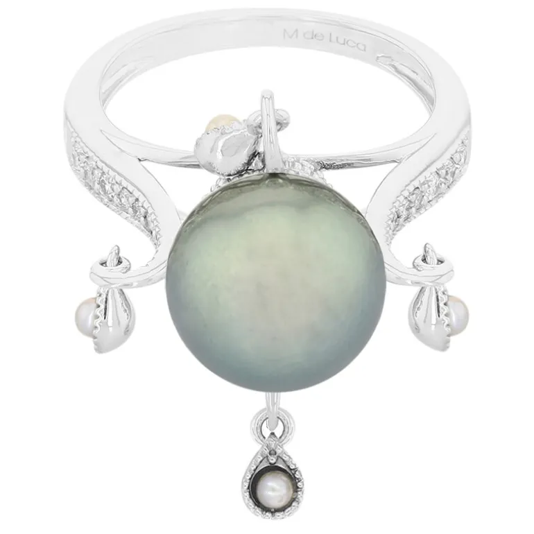 Entdecken Sie die Eleganz des Meeres mit diesem exquisiten Ring mit einer glänzenden 11 mm großen runden Tahiti-Perle, die von funkelnden SI-Diamanten von insgesamt 0,123 ct ergänzt wird. Das Band aus 10 Karat Weißgold mit einem Gewicht von ca. 4,22 g verleiht diesem einzigartigen Schmuckstück einen Hauch von Raffinesse, der durch vier zarte Süßwasserperlen aus China noch verstärkt wird. Dieser Ring eignet sich perfekt für besondere Anlässe und vervollständigt jede Abendgarderobe mit seinem fesselnden Charme und seiner raffinierten Anmut.