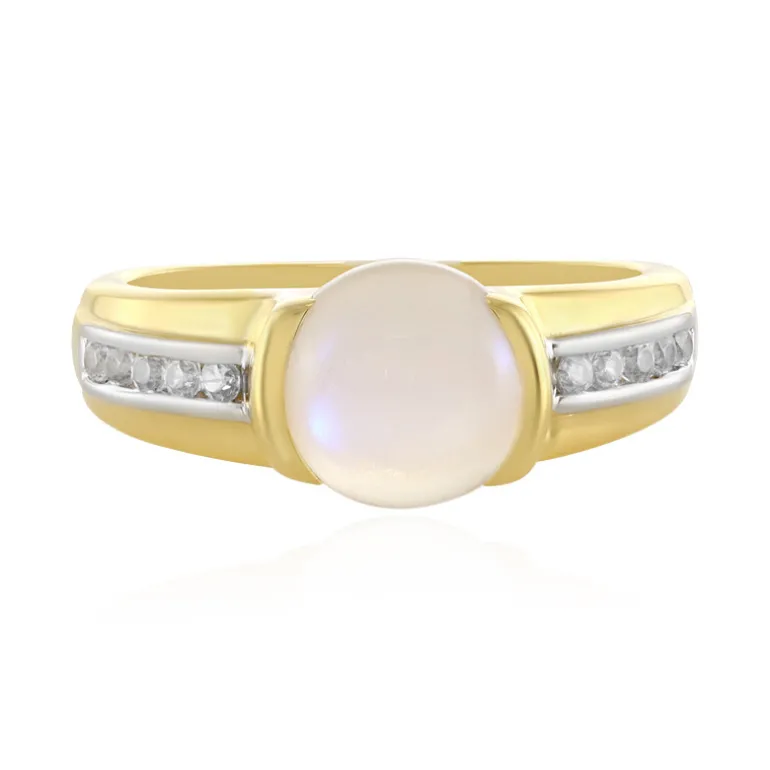 Entdecken Sie die Anziehungskraft des tansanischen Regenbogenmondsteins mit diesem eleganten Ring aus vergoldetem Sterlingsilber. Sein Herzstück, ein 1,71 Karat großer runder Cabochon-Mondstein, strahlt mit einem ätherischen Glanz, der durch das Funkeln von zehn Zirkonen im Rundschliff aus Kambodscha elegant ergänzt wird. Mit einem Gesamtkaratgewicht von 1,872 ct, gefasst in ca. 3,22 g Sterlingsilber, bietet dieser Ring ein exquisites Gleichgewicht von Pracht und Anmut. Er ist ideal, um Ihrem Outfit einen Hauch von Raffinesse zu verleihen, und eignet sich sowohl für zwanglose Brunchs als auch für formelle Abende.