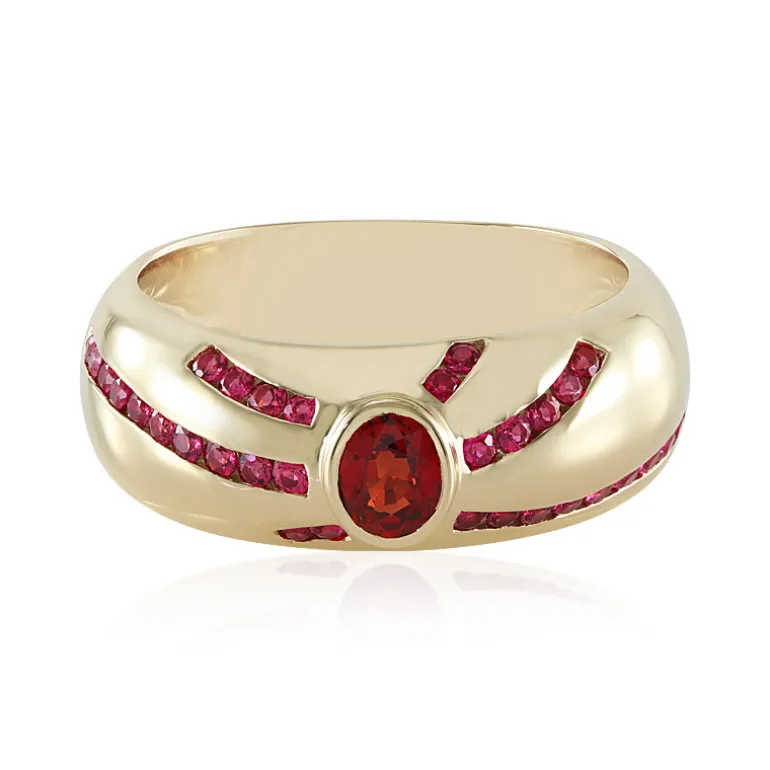 Entdecken Sie das Strahlen tansanischer Edelsteine mit diesem Ring aus 9 Karat Gold, der einen Rubin von 0,428 Karat im Ovalschliff elegant in Szene setzt, umgeben von einem verspielten Reigen aus 33 rosafarbenen Spinellen von insgesamt 0,568 Karat. Dieser Ring ist für alle gedacht, die einen raffinierten Stil mit einem Hauch von lebendiger Farbe lieben und ein luxuriöses Statement abgeben möchten. Das hohe Gesamtgewicht der Edelsteine und die hochwertige Goldfassung werden jeden Schmuckliebhaber beeindrucken. Er eignet sich perfekt, um der Abendgarderobe einen farbigen Akzent zu verleihen oder das Alltagsoutfit mit seinem warmen goldenen Schimmer und den leidenschaftlichen Farbtönen aufzuwerten.