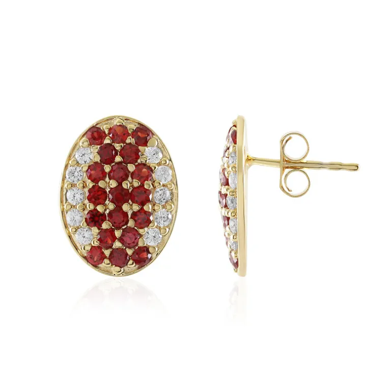 Entdecken Sie die Faszination dieser vergoldeten Ohrringe aus 925er Sterlingsilber, die mit 38 glänzenden tansanischen Rubinen im Brillantschliff von insgesamt 1,496 ct. besetzt sind. Diese ovalen Ohrstecker sind mit einem Halo aus 20 strahlenden kambodschanischen Zirkonen verziert und verleihen jedem Ensemble einen klassischen Touch. Sie sind ideal, um Ihrem Abendlook einen opulenten Farbakzent zu verleihen oder Ihre Tagesgarderobe aufzuwerten, und sind ein vielseitiger Schatz für Ihre Sammlung.