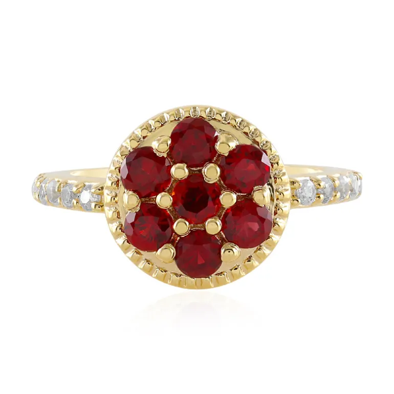 Dieser elegante Ring besticht durch sieben tansanische Rubine im Rundschliff mit einem Gesamtgewicht von 0,935 Karat. Das Band aus 925er Sterlingsilber ist für ein luxuriöses Finish vergoldet und wird von zwölf Zirkonen aus Kambodscha akzentuiert. Dieser Ring eignet sich perfekt für formelle Anlässe oder als eleganter Begleiter für den Alltag und passt sowohl zur Abendgarderobe als auch zu eleganten Freizeitoutfits.