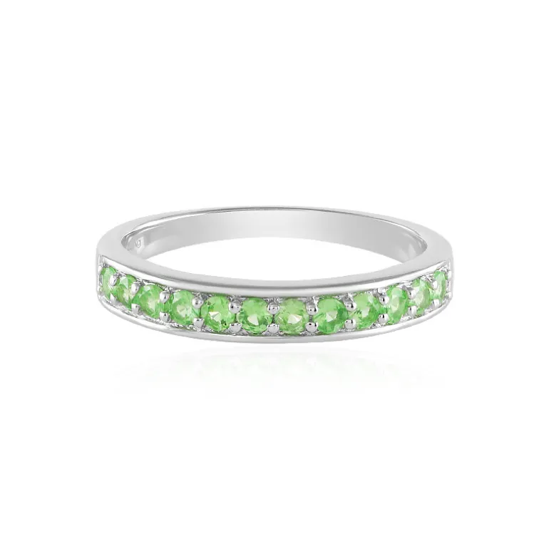 Entdecken Sie die Faszination dieses Meisterwerks aus Sterlingsilber, das Ihren Finger in üppigen grünen Glanz hüllt. Zwölf tansanische Tsavoriten im Rundschliff mit einem Gesamtgewicht von 0,486 Karat funkeln im Einklang mit dem Band. Dieser Ring, der mit einer Platinbeschichtung für dauerhaften Glanz versehen ist, verkörpert das Wesen moderner Eleganz. Sein geringes Gewicht von etwa 2,06 Gramm sorgt für Komfort bei jeder Geste. Dieses auffällige Schmuckstück setzt einen farbigen Akzent in der Tagesgarderobe oder ist eine schicke Ergänzung zur Abendgarderobe – perfekt für jede Gelegenheit, die einen Hauch von Raffinesse verlangt.