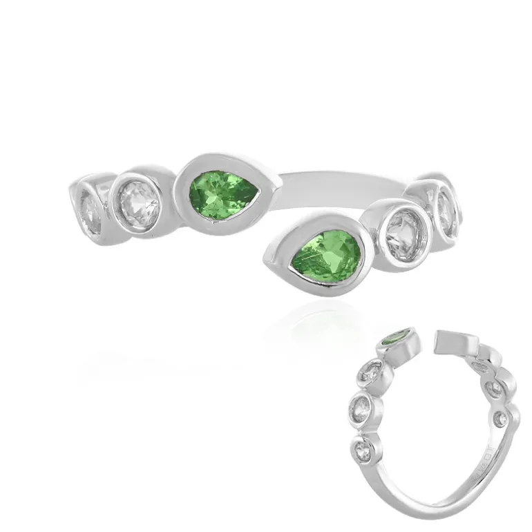Entdecken Sie die Anziehungskraft dieses einzigartigen Rings, der glänzende tansanische Tsavorit-Edelsteine von insgesamt 0,271 Karat zeigt, die harmonisch mit funkelnden kambodschanischen Zirkon-Akzenten von 0,454 Karat gepaart sind. Der tropfenförmige und der runde Schliff maximieren die Ausstrahlung der Steine, die alle wunderschön in platiniertes 925er Sterling Silber gefasst sind. Mit einem Gewicht von etwa 2,34 Gramm und einer verspielten Anordnung glänzt dieser Ring in einem modernen Tropfen-Design. Perfekt, um Ihrem Alltagsoutfit einen Farbakzent zu verleihen oder Ihre Abendgarderobe zu verschönern.