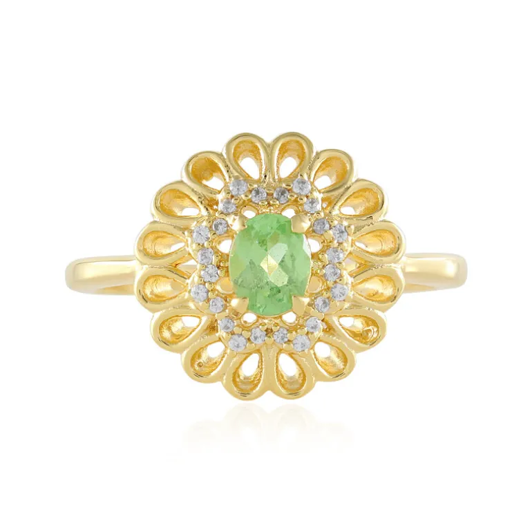 Entdecken Sie den exquisiten Charme dieses Rings mit tansanischem Tsavorit. Der ovale Edelstein im Brillantschliff, umgeben von kambodschanischen Zirkonen, funkelt auf vergoldetem Sterlingsilber. Dieser Ring eignet sich perfekt für einen schicken Abendlook oder als eleganter Begleiter für den Alltag und ist ein Statement für Stil und Raffinesse. Kombinieren Sie ihn sowohl mit legerer als auch mit formeller Kleidung und werten Sie Ihr Ensemble auf.