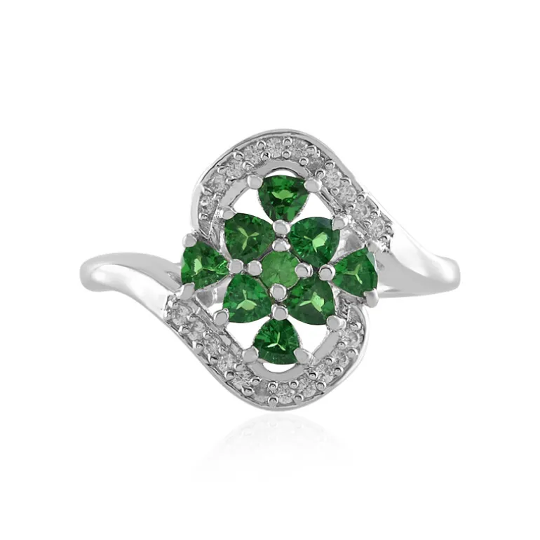 Erfreuen Sie sich an der frischen Eleganz dieses Rings aus Sterlingsilber mit funkelnden Tsavoriten im Trillion-Schliff (0,414ct) aus Tansania, die von einem runden Tsavorit (0,045ct) in der Mitte ergänzt und von einem Zirkon (0,144ct) aus Kambodscha eingerahmt werden. Mit einem Gesamtgewicht von 0,603 ct glänzt dieser 21×20 mm große Ring mit einem Design, das an die Pracht der Natur erinnert. Er ist perfekt geeignet, um sowohl Tages- als auch Abendgarderobe einen leuchtenden Farbakzent zu verleihen und wird bei jeder Veranstaltung für Gesprächsstoff sorgen.