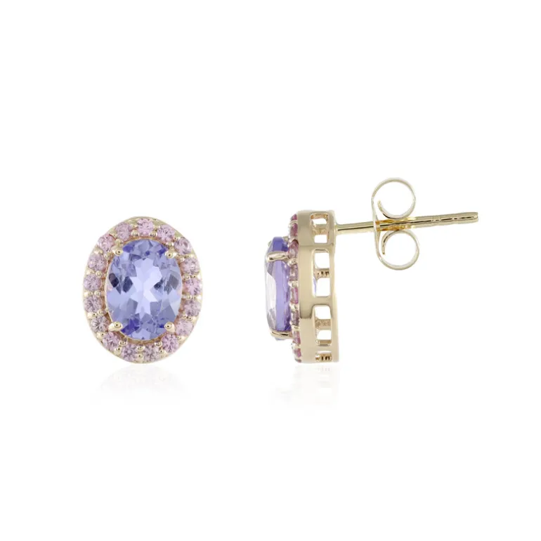 Entdecken Sie die fesselnde Anziehungskraft dieser ovalen Tansanit-Ohrstecker, die elegant von einem Halo aus funkelnden rosa Saphiren aus Madagaskar eingerahmt werden. Sie sind in 375er Gelbgold gefasst und haben ein Gesamtkaratgewicht von 3,306 ct und strahlen Raffinesse aus. Die Mischung aus satten Violett- und zarten Rosatönen macht sie zu einem vielseitigen Schmuckstück, das sich sowohl für formelle Anlässe als auch für den täglichen Luxus eignet. Mit einer perfekten Größe von 12 mm verleihen sie jedem Ensemble einen Hauch von zeitloser Eleganz.