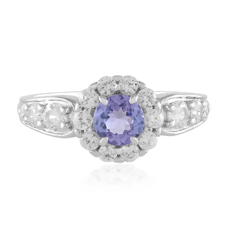 Entdecken Sie die Anziehungskraft dieses exquisiten Tansanit-Rings aus 9 Karat Weißgold mit einem tansanischen Tansanit in der Mitte, umgeben von kambodschanischen Zirkonen. Mit einem Gesamtkaratgewicht von 1,476 Karat verleiht dieser Ring jeder Garderobe einen glamourösen Touch. Er eignet sich perfekt für formelle Anlässe oder als Statement-Stück und lässt sich elegant mit Abendgarderobe oder einem schicken Cocktailkleid kombinieren, das Eleganz und Raffinesse ausstrahlt.