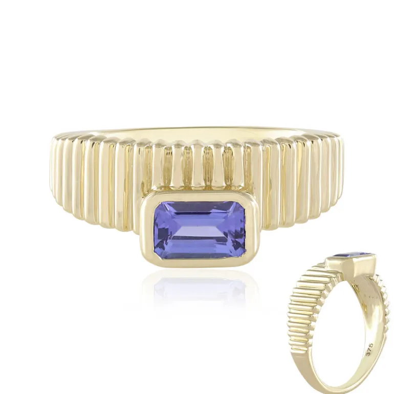 Dieser exquisite Tansanit-Goldring ist mit einem atemberaubenden Tansanit von 0,56 Karat im Oktagon-Schliff aus Tansania besetzt und in 9 K Gelbgold gefasst. Sein geripptes Band verleiht ihm einen Hauch von moderner Eleganz und macht ihn perfekt für jede Gelegenheit. Kombinieren Sie ihn mit einer schicken Abendgarderobe, um seinen violetten Farbton und sein einzigartiges Design hervorzuheben, das mühelos Aufmerksamkeit und Bewunderung erregt.