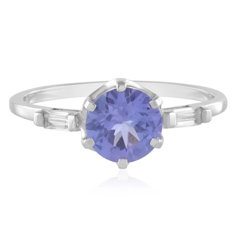 Entdecken Sie Eleganz mit diesem Tansanit-Ring aus Weißgold. Der Ring mit einem Tansanit im Rundschliff aus Tansania glänzt mit einem auffälligen violetten Farbton. Zwei kambodschanische Zirkon-Baguetten verleihen ihm einen Hauch von Brillanz. Gefertigt aus 375er Weißgold ist er leicht und dennoch luxuriös. Er eignet sich perfekt für Hochzeiten oder einen eleganten Abend und lässt sich sowohl mit formeller als auch mit legerer Kleidung kombinieren.