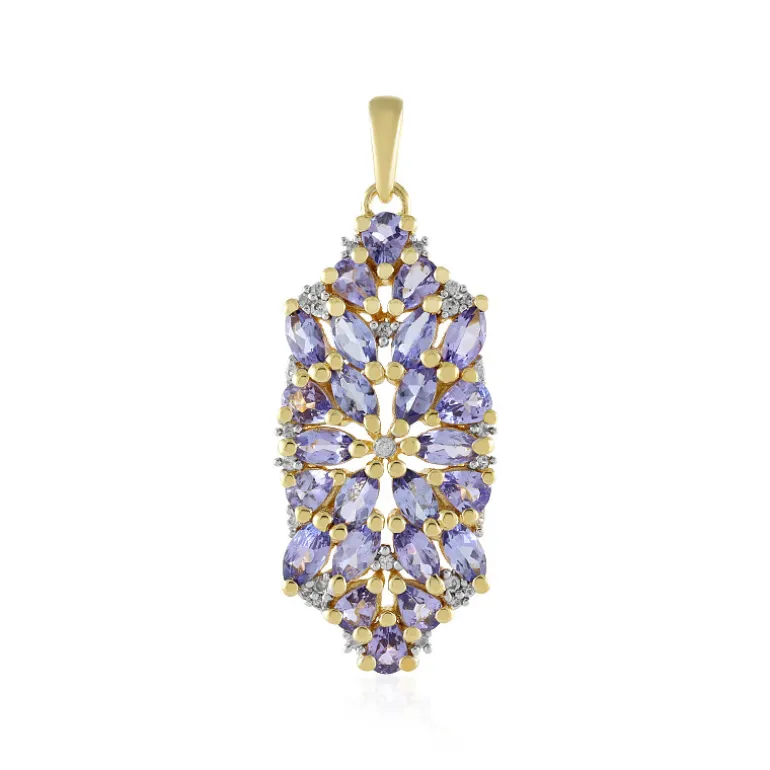 Dieser bezaubernde Anhänger zeigt ein atemberaubendes Arrangement aus tansanischen Tansaniten und kambodschanischen Zirkonen. Der Anhänger aus vergoldetem 925er Sterlingsilber hat einen Marquise- und einen Tropfenschliff, die ein schillerndes florales Muster bilden. Er ist ideal für elegante Abende oder formelle Anlässe und kann mit einem schlichten Kleid kombiniert werden, um seine leuchtenden Farbtöne zur Geltung zu bringen. Eine raffinierte Wahl für Edelsteinliebhaber.