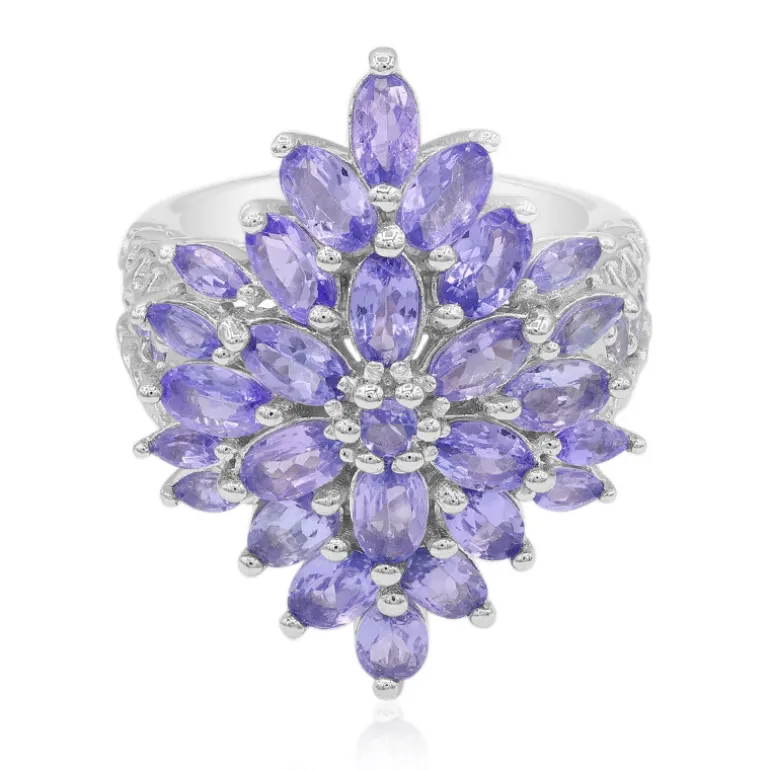 Dieser exquisite Tansanit-Ring zeigt ein atemberaubendes Blumendesign mit 18 ovalen, 8 marquisen und 7 runden Tansaniten aus Tansania. In 925er Sterling Silber gefasst, sorgen die violetten Farbtöne der 4,725 Karat schweren Edelsteine für einen bezaubernden Look. Perfekt für elegante Abende oder besondere Anlässe. Kombinieren Sie dieses Schmuckstück mit einem schlichten Kleid, um seinen Glanz zur Geltung zu bringen. Ein ideales Geschenk für Edelsteinliebhaber.