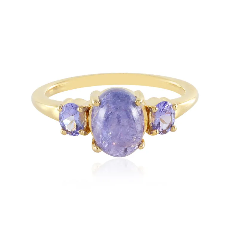 Entdecken Sie die heitere Schönheit dieses luxuriösen Rings mit einem Trio aus bezaubernden Tansaniten von insgesamt 1,89 Karat aus Tansania. Der zentrale Stein, ein ovaler Cabochon in kräftigem Farbton, wird von zwei ovalen Tansaniten mit Facettenschliff akzentuiert, die alle wunderschön auf einem glänzenden Band aus vergoldetem 925er Sterlingsilber inszeniert sind. Dieses Schmuckstück fängt die Anziehungskraft eines Abendhimmels ein und verspricht, Ihren Stil zu verbessern. Es eignet sich perfekt für Dinner-Events oder als raffinierter Akzent für Ihre Bürokleidung und ist eine vielseitige Ergänzung für jede Schmucksammlung.