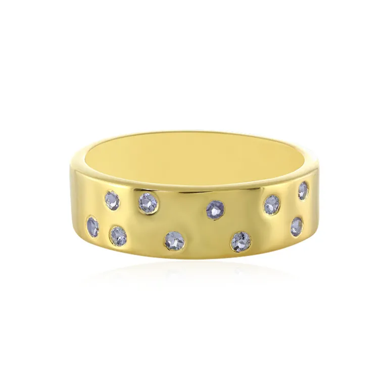 Entdecken Sie die Faszination der tansanischen Tansanite mit diesem auffälligen Ring aus vergoldetem 925er Sterlingsilber. Jeder der 10 Edelsteine im Rundschliff, die perfekt entlang des Rings angeordnet sind, fängt die Essenz der pulsierenden Landschaften Tansanias ein. Das kräftige Profil des Rings und der Kontrast zwischen dem satten Goldton und den kühlen blauen Tansaniten verleihen der klassischen Eleganz eine moderne Note und machen dieses Schmuckstück zu einem idealen Begleiter für legere Anlässe und anspruchsvolle Veranstaltungen. Das Gesamtgewicht des Rings von 0,375 ct sorgt für ein dezentes, aber faszinierendes Funkeln. Lassen Sie sich von der Schönheit der Tansanite verzaubern und verleihen Sie Ihrer Schmucksammlung einen Hauch von weltlicher Raffinesse.