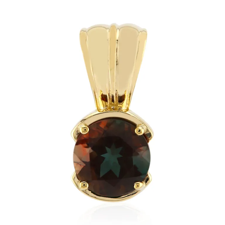 Entdecken Sie die Faszination des Ostens mit diesem bezaubernden Tibetanit-Anhänger. Dieser 0,935 Karat schwere Edelstein wurde im Herzen Tibets abgebaut und fachmännisch in eine runde Form geschliffen, die seine kaleidoskopischen Farbtöne zum Vorschein bringt. Der in 9-karätigem Gelbgold gefasste Anhänger mit einem Gewicht von ca. 1,87 Gramm ist ein Zeugnis von Luxus und Mystik. Die tiefen, schillernden Farben des Tibetanit machen ihn zu einem auffälligen Schmuckstück, das zu jeder Kleidung passt und sich besonders für elegante Abendgarderobe eignet. Ein Edelstein, der nicht nur Ihrer Garderobe einen Hauch von Raffinesse verleiht, sondern auch den Zauber der tibetischen Traditionen in sich trägt.