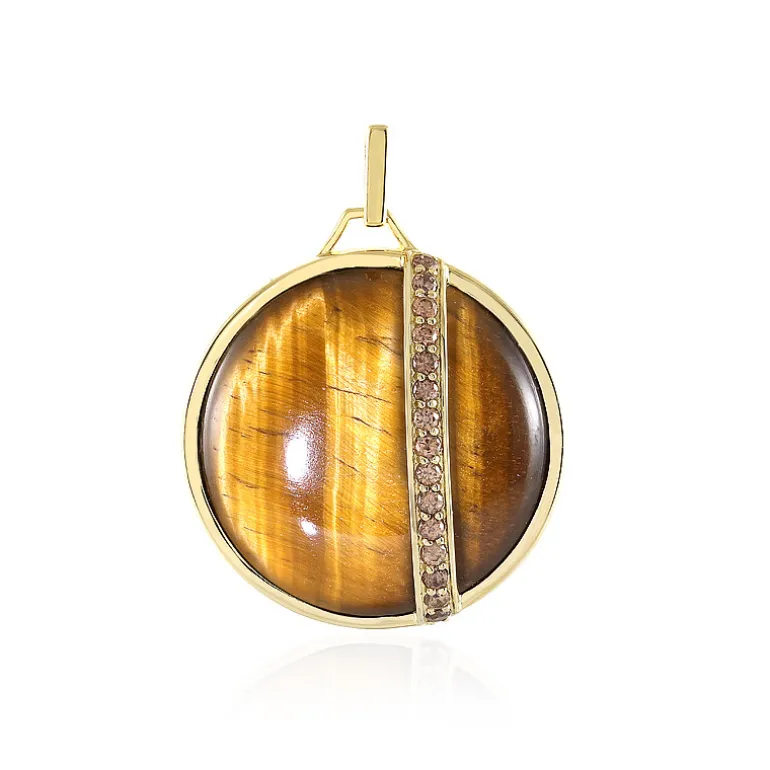 Unser strahlender 36-karätiger mexikanischer Tigerauge-Anhänger ist ein Schatz, der die Faszination der Wildnis verkörpert. Fein gefasst in 925er Sterlingsilber mit reicher Goldplattierung, besticht dieser Anhänger mit einem 36-karätigen runden Cabochon-Stein, der für seine fesselnden goldenen bis braunen Farbtöne bekannt ist. Er ist mit 0,675 ct champagnerfarbenen Zirkonen aus Kambodscha besetzt und verleiht ihm einen subtilen Hauch von Glamour. Mit seinen Maßen von 40 x 30 mm ist er ein auffälliges Schmuckstück, das sowohl im Alltag als auch bei besonderen Anlässen getragen werden kann. Kombinieren Sie ihn mit Erdtönen für einen harmonischen, schicken Look oder kontrastieren Sie ihn mit dunkler Kleidung für einen atemberaubenden Farbakzent.