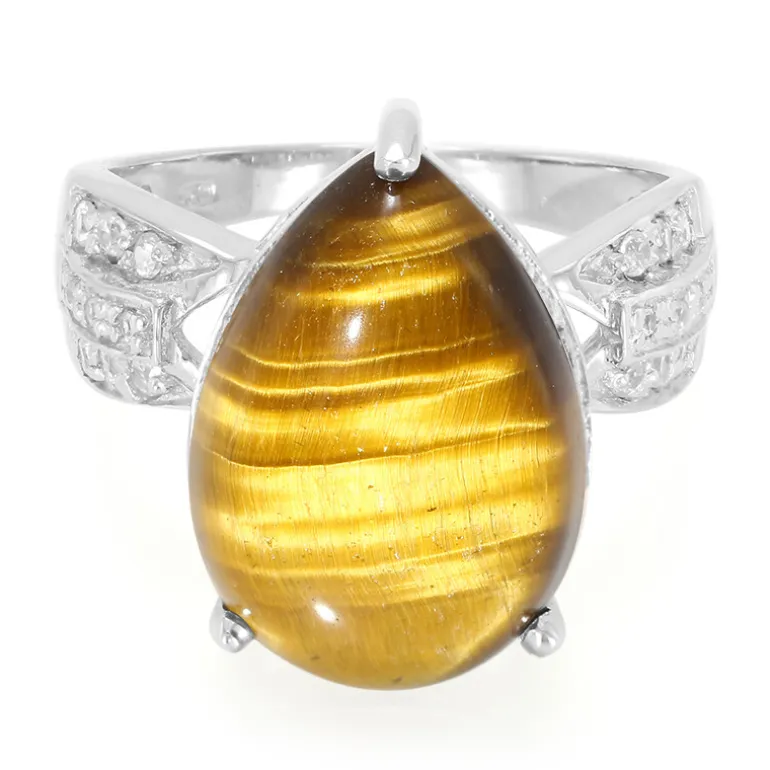 Lassen Sie sich von den faszinierenden Streifen dieses südafrikanischen Tigerauge-Rings verzaubern, der elegant mit funkelnden Zirkon-Akzenten aus Kambodscha harmoniert. Der tropfenförmige Cabochon von 9,36 Karat mit seinen hypnotisierenden goldbraunen Farbtönen ist sorgfältig in poliertes 925er Sterlingsilber gefasst und wiegt etwa 4,26 Gramm. 12 runde Zirkone im Brillantschliff von insgesamt 0,282 Karat verleihen dem Tigerauge einen Hauch von Brillanz, der durch sechs weitere Zirkone von 0,043 Karat ergänzt wird. Dieses atemberaubende Schmuckstück verkörpert sowohl Kühnheit als auch Raffinesse und ist damit ein vielseitiges Statement für den eleganten Alltag oder besondere Anlässe. Kombinieren Sie ihn mit erdigen Tönen oder einem eleganten schwarzen Ensemble für einen wahrhaft hypnotisierenden Effekt.