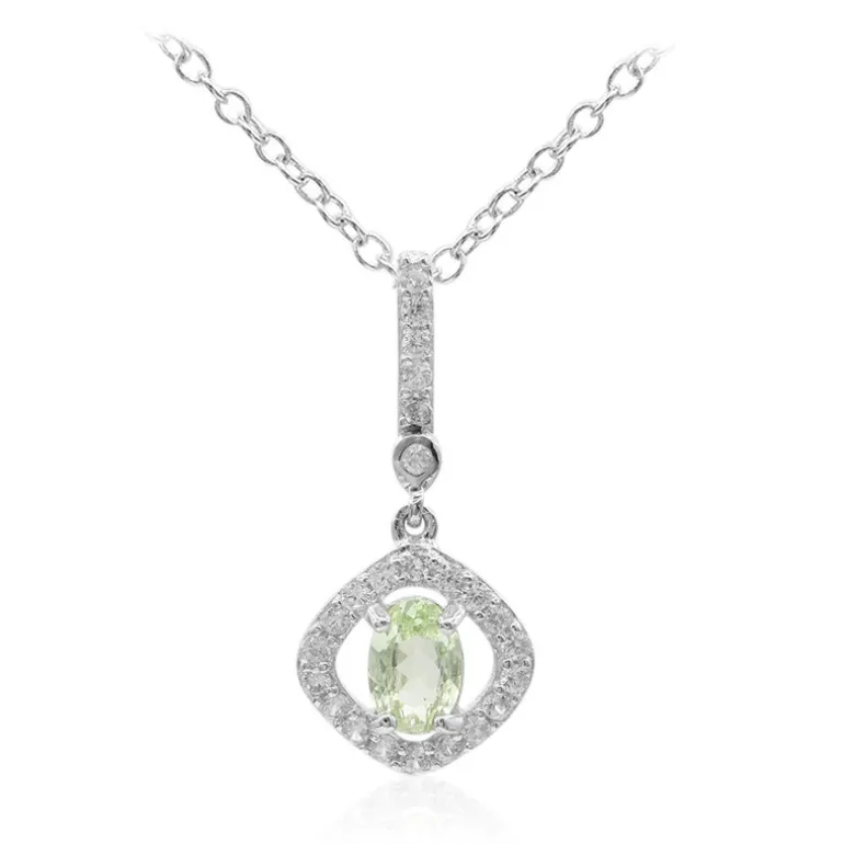 Dieses bezaubernde Collier zeigt einen tansanischen Tsavorit im Ovalschliff von 0,432 ct, der in einer funkelnden Umarmung aus Zirkonen im Rundschliff von insgesamt 0,228 ct eingefasst ist. Der aus 925er Sterlingsilber gefertigte Anhänger baumelt an einer 45,5 cm langen Kette und hat ein Gesamtgewicht von 0,675 Karat. Die moderne Silhouette und der frische Grünton machen ihn zu einem großartigen Accessoire für den eleganten Alltag und besondere Anlässe. Kombinieren Sie dieses bezaubernde Schmuckstück mit einem Cocktailkleid oder einer schicken Bluse für einen sofortigen Aufschwung.