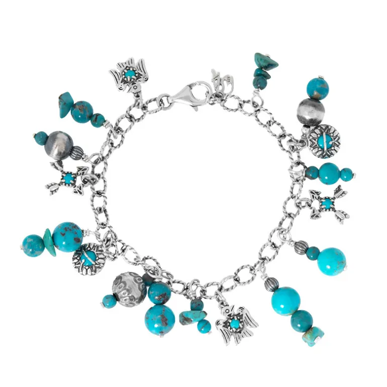 Entdecken Sie die Anziehungskraft unseres Türkis-Sterlingsilber-Armbandes. Dieses 18 cm lange Schmuckstück mit lebhaftem Türkis aus den USA präsentiert einen exquisiten Mix aus Perlen- und Cabochon-Formen von insgesamt 24,18 ct. Es ist perfekt, um jedem Outfit einen Hauch von Wüsten-Chic zu verleihen und ist ein ideales Accessoire für legere und formelle Anlässe. Kombinieren Sie es mit Ihrer Lieblingsjeans oder einem eleganten schwarzen Kleid für einen atemberaubenden Look.