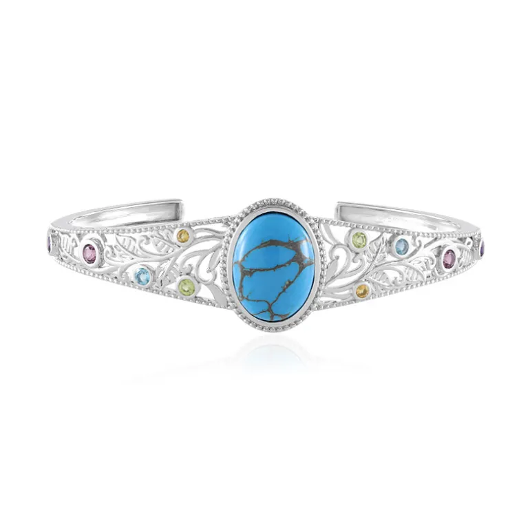 Entdecken Sie den lebendigen Charme dieses Armreifs aus Sterlingsilber mit einem exquisiten 6,21-karätigen Türkis aus den USA. Akzentuiert durch lebendige Edelsteine wie Rhodolith, Amethyst, Peridot, Topas und Citrin, ist dieser Armreif eine perfekte Mischung aus Eleganz und Farbe. Das vielseitige Schmuckstück eignet sich sowohl für legere als auch für besondere Anlässe und lässt sich sowohl mit modernen als auch mit klassischen Outfits wunderbar kombinieren.