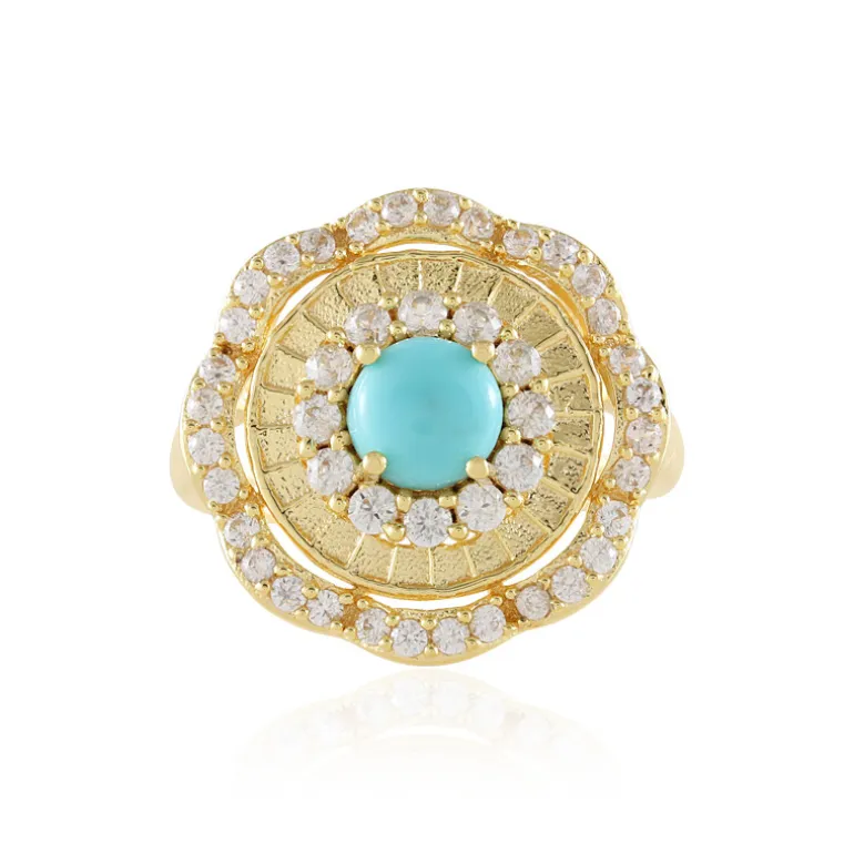 Entdecken Sie die Eleganz dieses atemberaubenden Rings aus vergoldetem Sterlingsilber mit einem faszinierenden runden Cabochon-Türkis aus den USA. Umgeben von funkelnden Zirkonen aus Kambodscha, strahlt dieses Schmuckstück Luxus und Charme aus. Er eignet sich sowohl für formelle Anlässe als auch für zwanglose Ausflüge und lässt sich wunderbar mit leichten Sommerkleidern oder eleganter Abendgarderobe kombinieren. Erhöhen Sie Ihren Stil mit diesem exquisiten Mittelstück von 1,93 Karat.