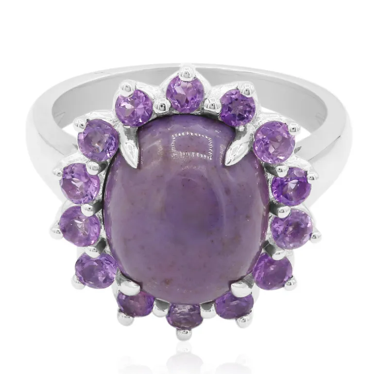 Lassen Sie sich von der Anziehungskraft des Ostens verzaubern mit diesem prächtigen Ring, der einen wunderschönen ovalen Cabochon aus türkischer Jade von 4,505 Karat zeigt, der von einem Halo aus funkelnden brasilianischen Amethysten im Rundschliff von 0,75 Karat umgeben ist. Das aus hochwertigem 925er Sterlingsilber gefertigte Schmuckstück wiegt ca. 4,58 Gramm und verbindet Langlebigkeit mit einer anmutigen Präsenz an Ihrem Finger. Dieser Ring ist perfekt geeignet, um Ihrer Abendgarderobe einen Hauch von raffinierter Eleganz zu verleihen und sorgt bei jeder gesellschaftlichen Veranstaltung für Gesprächsstoff.