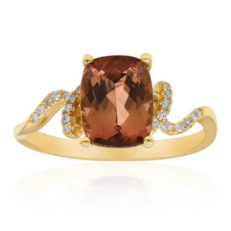 Entdecken Sie die warme Anziehungskraft dieses Rings mit Madagaskar-Turmalin, einem Schatz in satten Karamelltönen. Der meisterhaft in 14 Karat Gelbgold gefasste Edelstein im Antikschliff wiegt beeindruckende 2,23 ct und wird von funkelnden SI2-Diamanten von insgesamt 0,07 ct umrahmt. Mit einem ungefähren Goldgewicht von 2,01 g strahlt dieses exquisite Stück Luxus aus. Er eignet sich perfekt für besondere Anlässe oder als eleganter Begleiter für den Alltag. Er ergänzt Outfits in Erdtönen oder bildet einen schönen Kontrast zu kühleren Farben.