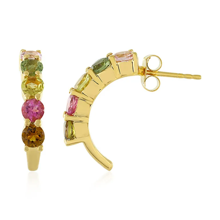 Diese vergoldeten Ohrringe aus 925er Sterlingsilber sind mit einer Reihe von mehrfarbigen Turmalinen aus Madagaskar besetzt, von denen jeder meisterhaft rund geschliffen ist. Mit einem Gesamtgewicht von 2,594 Karat glänzen diese Ohrringe mit ihren 4 mm großen Edelsteinen und einem ungefähren Silbergewicht von 3,85 Gramm. Die Größe von 22 mm sorgt für einen auffälligen und dennoch bequemen Sitz. Diese Ohrringe eignen sich sowohl für lässige Brunchs als auch für elegante Abende und sind eine vielseitige Ergänzung für jede Schmucksammlung.