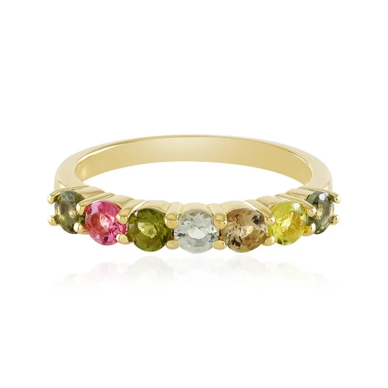 Dieser exquisite Ring ist mit sieben Turmalinen im Rundschliff aus Mosambik besetzt, die zusammen 0,794 Karat ausmachen. Der aus vergoldetem 925er Sterlingsilber gefertigte Ring strahlt Eleganz und Raffinesse aus und eignet sich sowohl für den Alltag als auch für besondere Anlässe. Kombinieren Sie es mit einem schlichten schwarzen Kleid oder einem farbenfrohen Outfit, um seinen farbenfrohen Charme und modernen Reiz zu unterstreichen.