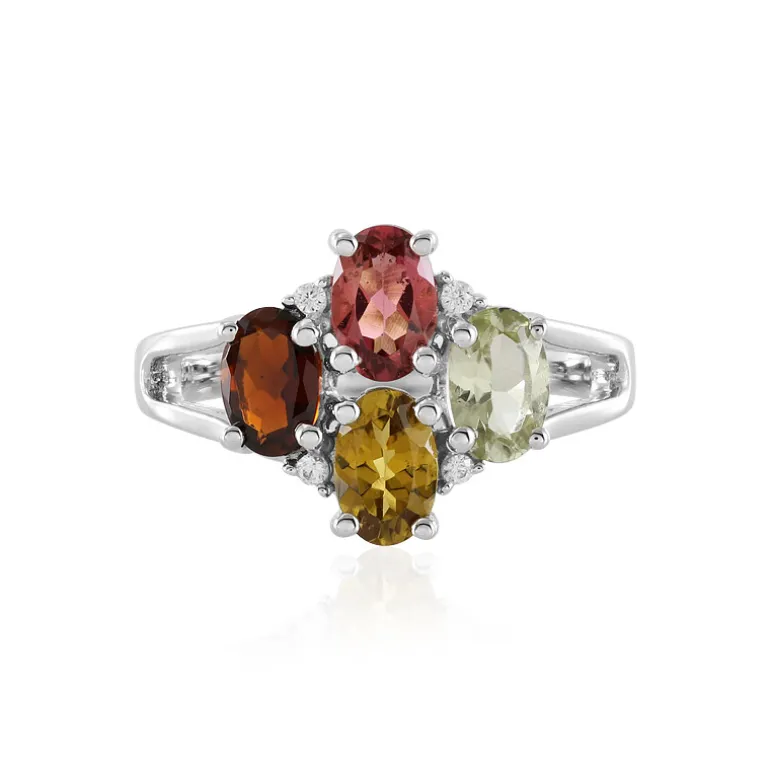 Entdecken Sie den lebendigen Charme unseres Multicolor Madagaskar Turmalin & Zirkon Silberrings. Dieses Schmuckstück mit einem Strauß warmtoniger Turmaline fängt die Essenz der herbstlichen Farbpalette in 1,52 Karat ovalem Glanz ein, der von dem subtilen Funkeln kambodschanischer Zirkone umgeben ist. Das Band aus 925er Sterlingsilber, das für zusätzlichen Glanz plattiert ist, hält die herrlich umrahmten Edelsteine fest. Dieser Ring ist ein ideales Accessoire, um Ihrer Alltagskleidung einen Farbakzent zu verleihen oder ein Abendoutfit aufzupeppen. Er verspricht Vielseitigkeit und Eleganz zu jedem Anlass.