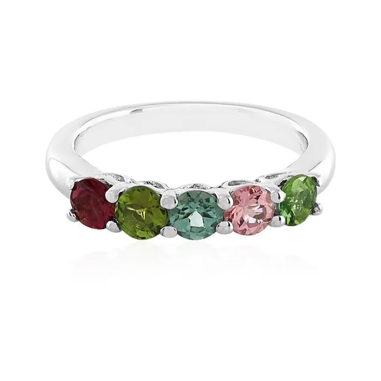 Erleben Sie das lebendige Spektrum der Natur mit diesem zarten Ring aus Regenbogenturmalin mit 0,733 Karat mosambikanischen Edelsteinen, gefasst in glänzendem platiniertem 925er Sterlingsilber. Jeder der fünf Edelsteine im Rundschliff wurde sorgfältig platziert, um einen Farbverlauf von satten, grünen Blättern bis hin zu tiefen, romantischen Rosatönen zu zeigen, der bei jeder Geste die Aufmerksamkeit auf sich zieht. Dieser Ring ist ein außergewöhnliches Schmuckstück oder ein durchdachtes Geschenk, das sowohl im Alltag als auch bei besonderen Anlässen einen Farbtupfer setzt.