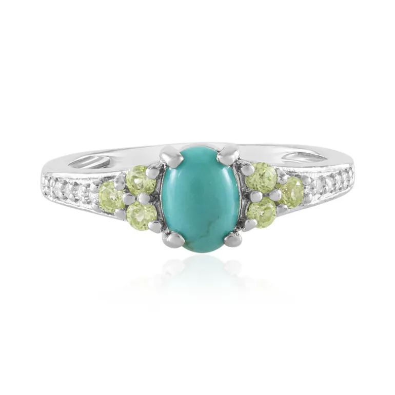 Entdecken Sie die Faszination dieses exquisiten Rings mit einem fesselnden 0,613-karätigen Tyrone-Türkiscabochon aus den USA, der von 6 lebhaften Peridots und 12 schimmernden Zirkonen akzentuiert wird. Gefertigt aus 925er Sterlingsilber mit einer eleganten Platinbeschichtung, bietet dieses Stück einen modernen und doch zeitlosen Reiz. Perfekt für zwanglose Ausflüge oder besondere Anlässe. Kombinieren Sie es mit einem fließenden Kleid, um seine Eleganz und seinen Charme zu unterstreichen.