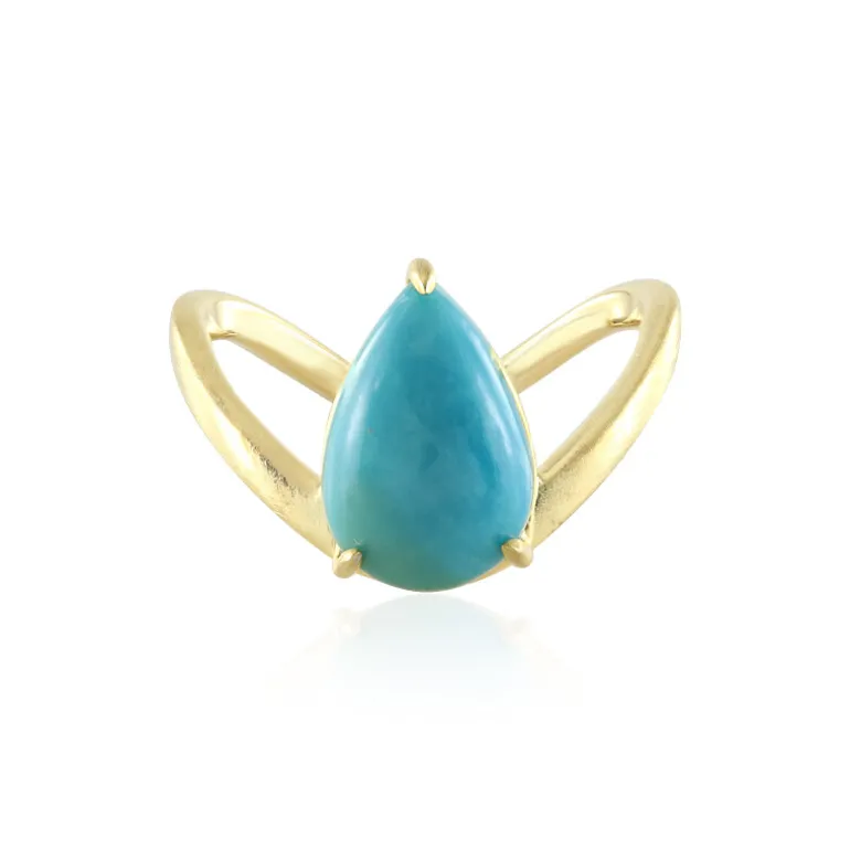 Entdecken Sie die Anziehungskraft des Tyrone Türkisrings mit einem 2,155 Karat großen tropfenförmigen Cabochon aus den USA, gefasst in glänzend vergoldetem 925er Sterlingsilber. Sein leuchtender Farbton und sein elegantes Design machen ihn zum idealen Begleiter für zwanglose Anlässe und anspruchsvolle Veranstaltungen. Kombinieren Sie ihn mit einem fließenden Kleid oder einem schicken Blazer für einen fesselnden Look, der auffällt.