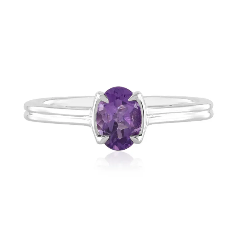 Entdecken Sie die Anziehungskraft dieses bezaubernden Rings aus platiniertem 925er Sterlingsilber, in dessen Zentrum ein lebendiger uruguayischer Amethyst im Ovalschliff sitzt. Der 0,609 Karat schwere Edelstein wird in einer einzigartigen, modernen Fassung exquisit in Szene gesetzt, die das Wesen der Raffinesse einfängt. Dieser Ring eignet sich sowohl für legere Eleganz als auch für formelle Anlässe und verleiht jedem Outfit einen Hauch von königlichem Lila, was ihn zu einer vielseitigen Ergänzung Ihrer Schmucksammlung macht.