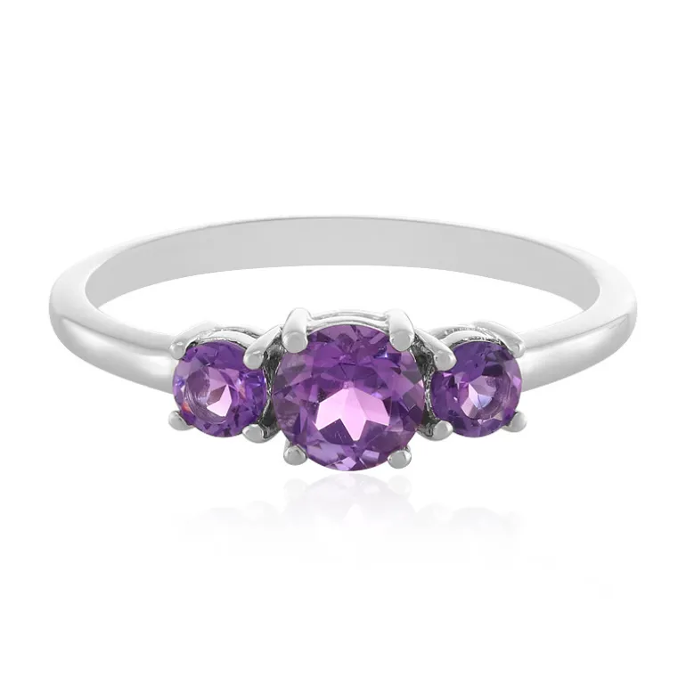 Entdecken Sie die Anziehungskraft unseres raffinierten uruguayischen Amethystrings, der mit atemberaubenden Edelsteinen im Rundschliff von insgesamt 1,229 Karat aufwartet. Gefertigt aus hochwertigem 925er Sterlingsilber mit einer Platinplattierung für zusätzlichen Luxus, bietet dieser Ring ein Trio aus lebhaften Amethysten mit satter, tiefer Farbe – ein zentraler Stein von ca. 6 mm, flankiert von zwei 4 mm großen Akzenten. Das schlichte Design ist zeitlos und eignet sich sowohl für den eleganten Alltag als auch für besondere Anlässe. Kombinieren Sie ihn mit Pastelltönen oder lassen Sie ihn vor einem Hintergrund in klassischem Schwarz oder Weiß erstrahlen.