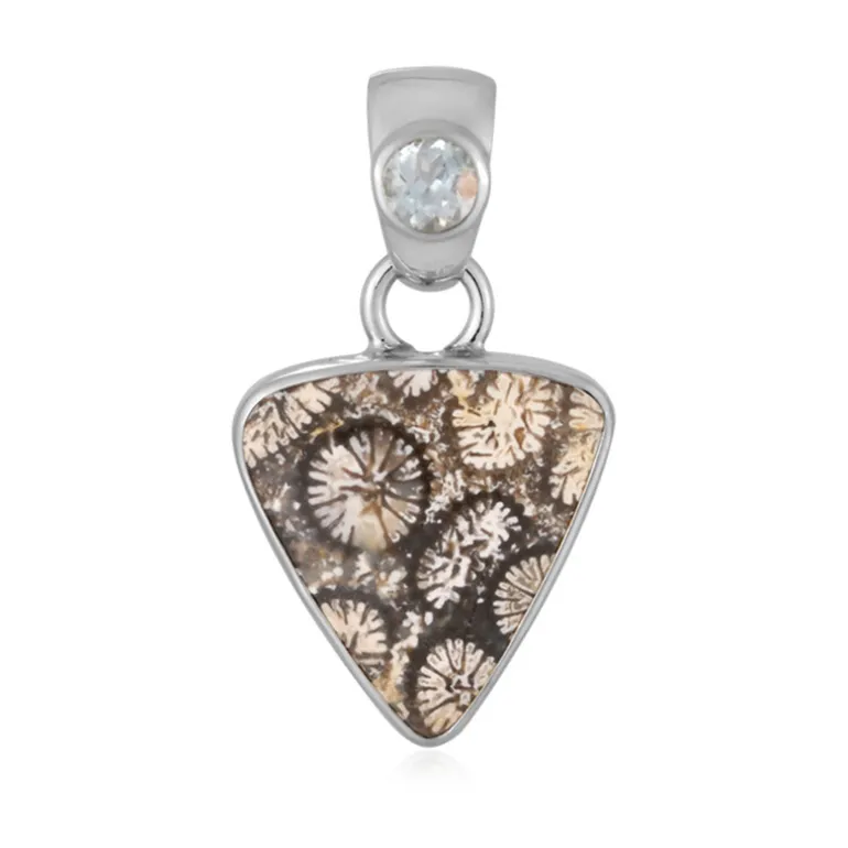 Entdecken Sie die bezaubernde Anziehungskraft dieses einzigartigen Fossil Coral-Anhängers, der mit einem funkelnden brasilianischen himmelblauen Topas kombiniert ist. Eine beeindruckende indonesische Koralle im Trillant-Schliff mit 4,5 Karat bildet den Hintergrund für die Kunstfertigkeit der Natur und wird durch einen runden Brillanttopas mit 0,2 Karat ergänzt. In glänzendem 925er Sterling Silber gefasst, fängt dieser Anhänger die Essenz des balinesischen Barong-Stils in einer modernen Dreiecks-Silhouette ein. Perfekt, um einem legeren Outfit einen Hauch von exotischer Eleganz zu verleihen oder als Gesprächsanlass bei gesellschaftlichen Anlässen zu dienen.