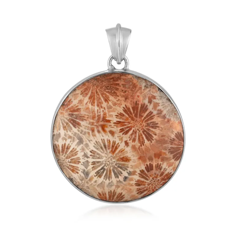 Entdecken Sie die Faszination Indonesiens mit diesem atemberaubenden Anhänger aus versteinerter Koralle, gefasst in 925er Sterlingsilber. Der runde 30-karätige Cabochon zeigt verschlungene natürliche Muster, die jedes Stück zu einem echten Unikat machen. Perfekt für die Eleganz des Alltags oder als exotisches Accessoire für besondere Anlässe. Dieser Anhänger passt sowohl zu legeren als auch zu formellen Outfits und verleiht Ihrem Ensemble einen Hauch von naturinspirierter Schönheit.