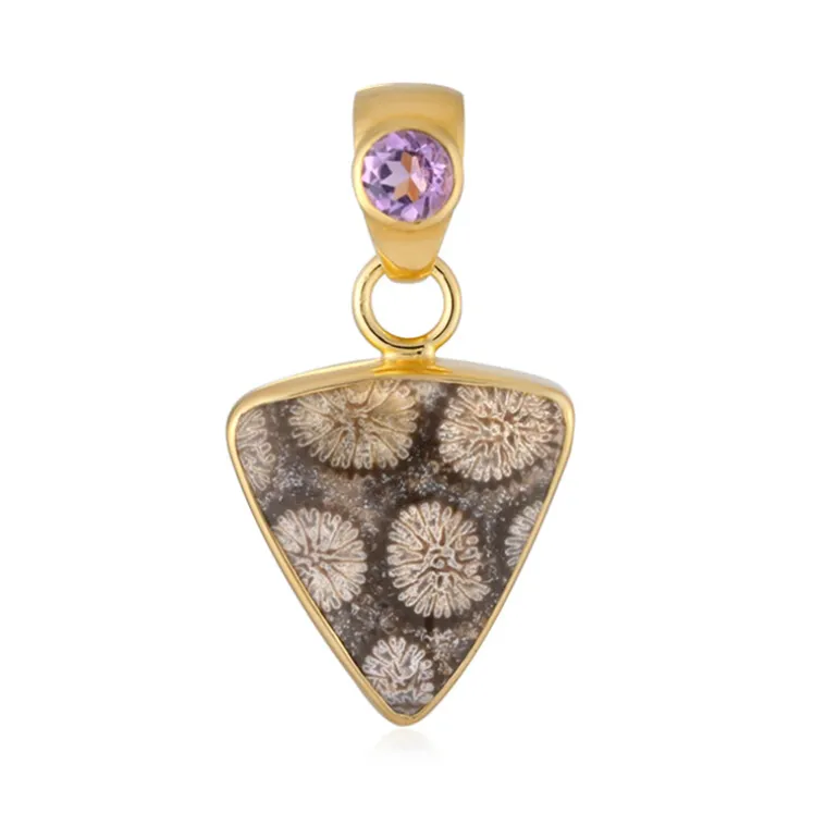 Trilliant Coral Fossil & Amethyst Vergoldeter Anhänger, 4,7ct