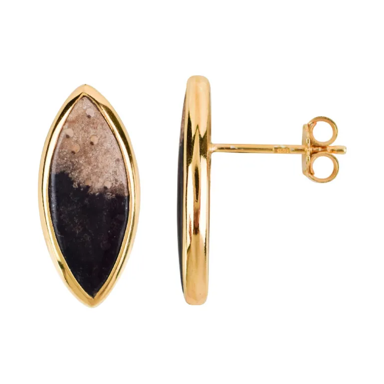 Lassen Sie sich von der prähistorischen Schönheit dieser Silberohrringe aus indonesischem versteinertem Holz verzaubern. Jeder Ohrring besteht aus einem 5,7-karätigen Marquise-Cabochon, der elegant in 925er Sterlingsilber mit einer glänzenden Goldplattierung gefasst ist. Mit einem Gewicht von ca. 2,45 g und einer Länge von 22 mm sind diese Schätze ein eindrucksvolles Statement von historischem Charme und zeitgenössischer Eleganz. Diese Ohrringe eignen sich perfekt als Ergänzung zu Ihrer Geschäftskleidung oder als Blickfang zu einem Abendkleid und sorgen auf jeder Veranstaltung für Gesprächsstoff.