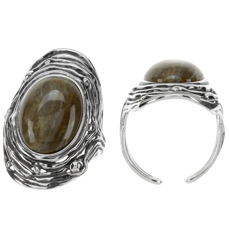 Tauchen Sie ein in die Anziehungskraft uralter Schönheit mit diesem Ring aus polnischem versteinertem Holz. Der ovale Cabochon von 7,2 Karat, eingebettet in 925er Sterlingsilber, und die erdigen Farbtöne dieses 16 x 12 mm großen Edelsteins strahlen zeitlose Eleganz aus. Das einzigartige Banddesign, das an die natürliche Textur von Holz erinnert, verleiht ihm einen rustikalen und doch raffinierten Touch. Dieser Ring ist ideal, um ein Statement zu lässigen Outfits zu setzen oder erdfarbene Ensembles aufzuwerten und sorgt für Gesprächsstoff bei geselligen Zusammenkünften oder Kunstveranstaltungen.