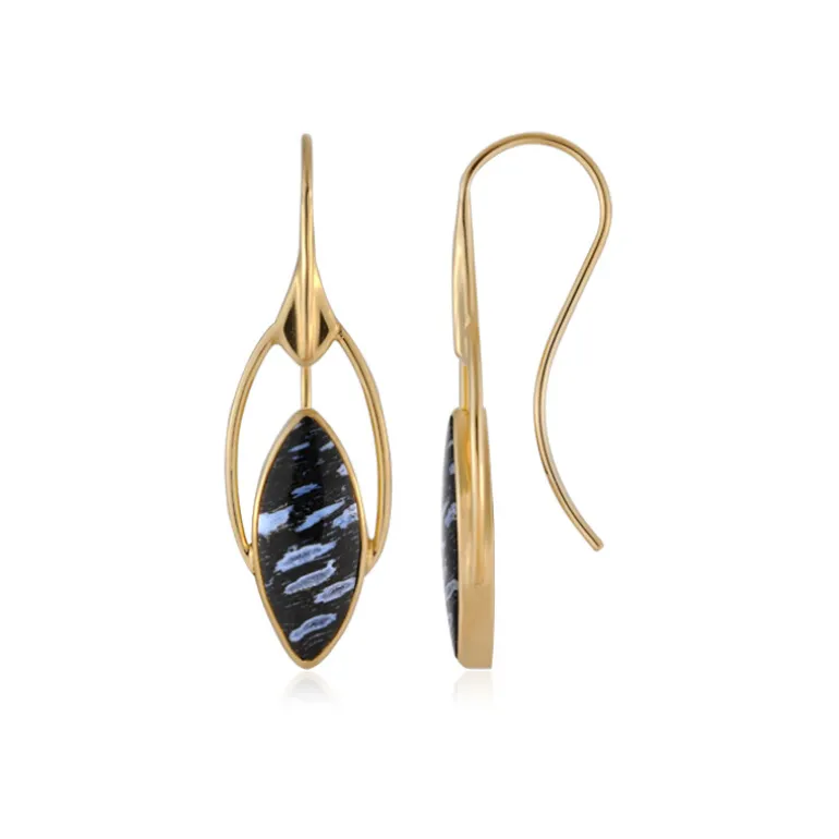Tauchen Sie ein in die mystische Schönheit Indonesiens mit diesen prächtigen Ohrringen aus vergoldetem Silber, die ein Gesamtgewicht von 12 Karat aufweisen. Jedes Stück ist elegant gefertigt, um einen Marquise-Cabochon aus versteinertem Jambi-Palmenholz zu halten, der den zeitlosen Charme von Balis Barong heraufbeschwört. Mit ihren ruhigen Mustern verleihen diese Ohrringe jedem Ensemble einen Hauch von von der Natur inspirierter Raffinesse und eignen sich sowohl für legere Brunchs als auch für formelle Abende.