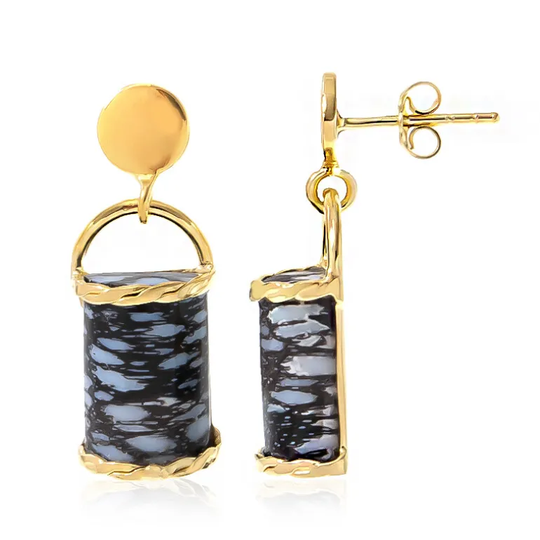 Entdecken Sie die Faszination der in Kunst verwandelten Natur mit diesen atemberaubenden Ohrringen, die die einzigartige Schönheit des versteinerten Jambi-Palmenholzes aus Indonesien zur Geltung bringen. Die Baguette-Cabochons aus vergoldetem 925er Sterlingsilber wiegen 11 Karat und messen jeweils ca. 14 x 9 mm. Mit einer Gesamtlänge von 30 mm sind sie perfekt, um jedem Ensemble einen Hauch von Eleganz zu verleihen. Diese Ohrringe eignen sich sowohl für zwanglose Brunchs als auch für elegante Dinnerpartys und sorgen für Gesprächsstoff auf jeder Veranstaltung.