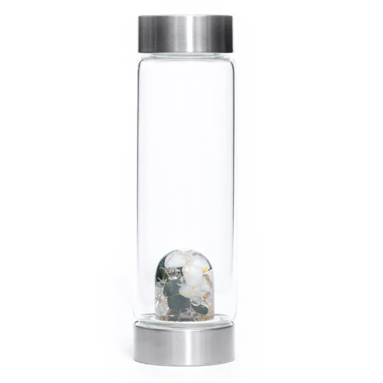 Tauchen Sie ein in die verjüngende Kraft der Edelsteine mit dieser exquisiten Vitality Water Bottle. Gefüllt mit einer sorgfältig ausgewählten Mischung aus Edelsteinen aus der ganzen Welt und mit einem Gesamtkaratgewicht von 300 Karat, bietet diese 500-ml-Flasche mehr als nur Flüssigkeitszufuhr; sie verwandelt Ihr Trinkerlebnis. Der ausgefallene Schliff und die unterschiedlichen Größen der Edelsteine sorgen für ein optisches Spektakel und machen die Flasche zu einem Statement für wellnessbewusste Menschen. Harmonisieren Sie Ihren Körper und Geist mit jedem Schluck, ob bei der Arbeit, beim Yoga oder in den ruhigen Momenten des Alltags.