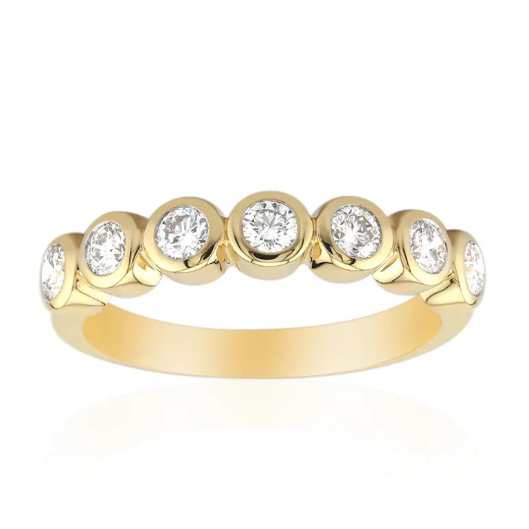 Entdecken Sie die Anziehungskraft der Raffinesse mit diesem raffinierten Ring aus 750er Gold, der sieben Diamanten der Klasse VVS1 in einer strahlenden Anordnung präsentiert. Jeder Diamant ist meisterhaft rund geschliffen, misst etwa 2,7 mm und hat ein Gesamtkaratgewicht von 0,525 ct. Das schlanke Design, ergänzt durch das glänzende 3g-Goldband, strahlt Eleganz für jeden Anlass aus. Dieser exquisite Ring eignet sich sowohl für legere als auch für formelle Anlässe und verleiht jedem Outfit einen Hauch von Klasse.