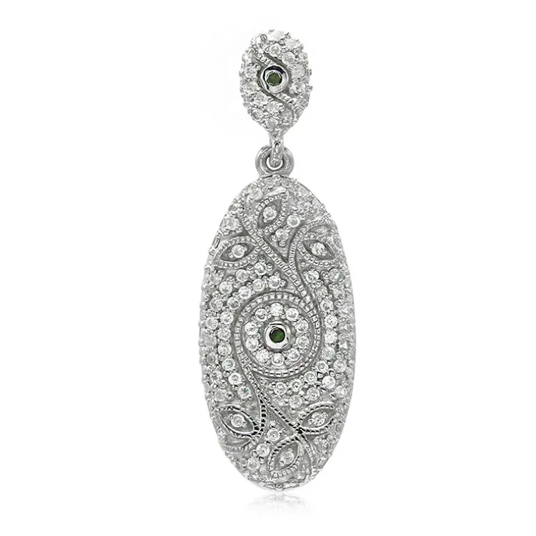 Entdecken Sie die Faszination der Natur mit diesem waldgrünen Diamantanhänger, einer Symphonie aus Silber. Ein Duo grüner Diamanten von insgesamt 0,02 Karat ist das Herzstück dieses Designs, ergänzt durch ein Gefolge von 124 funkelnden Zirkonen aus Kambodscha, die zusammen 0,881 Karat wiegen. Jeder Edelstein wurde fachmännisch geschliffen, um die Brillanz zu maximieren, und in hochwertiges 925er Sterlingsilber gefasst, mit einem ungefähren Gewicht von 3,62 g. Das komplizierte Muster und die Handwerkskunst machen diesen 35×12 mm großen Anhänger zu einem Zeugnis der Eleganz. Er eignet sich sowohl für einen eleganten Tag als auch für einen bezaubernden Abend und ist eine vielseitige Ergänzung für jede Schmucksammlung.